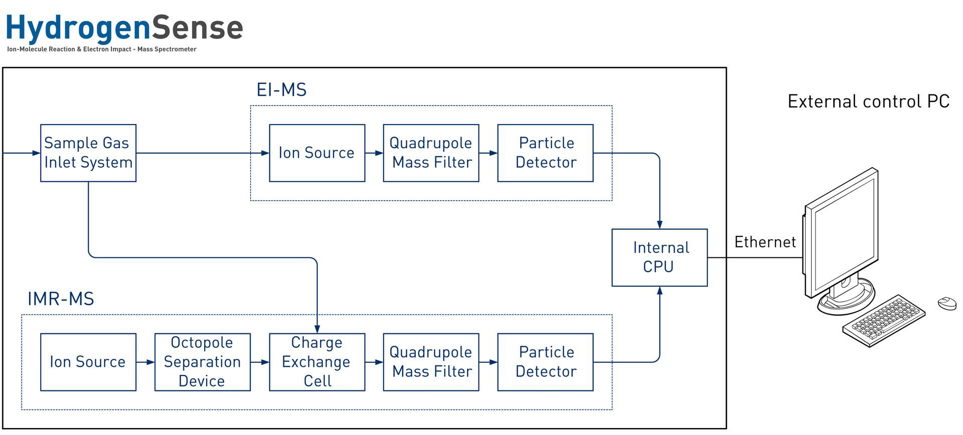 Die HydrogenSense ist ein Doppel-MS mit einer Kopplung von Ionen-Molekül Reaktion (IMR-MS) und Elektronenstoß-Ionisation (EI-MS) für die Multikomponenten-Gasanalyse.